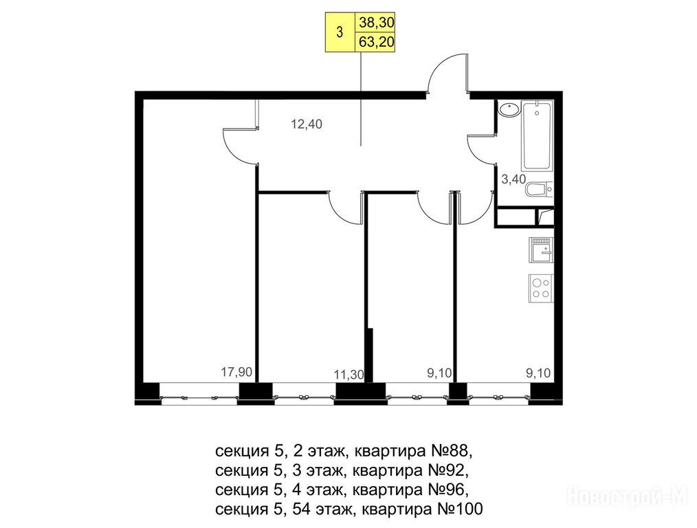 3-комн. квартира, 63.20 м2, 4 этаж