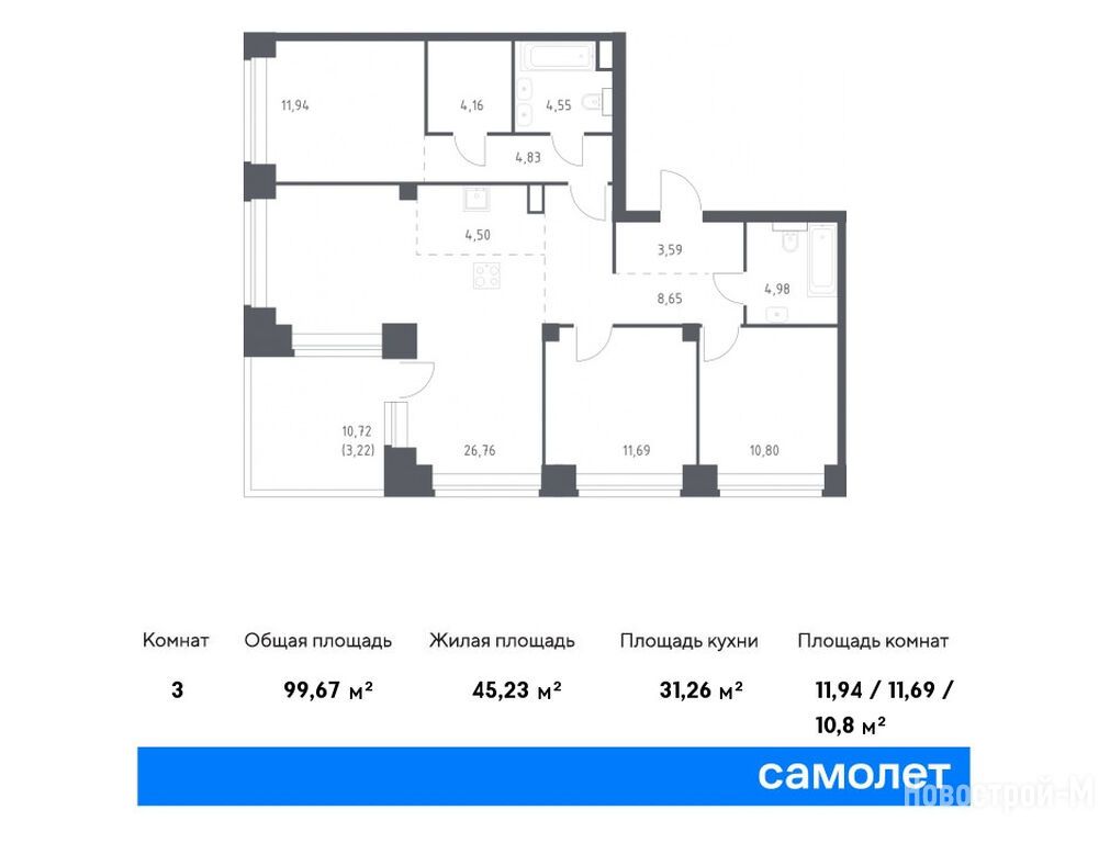 Продается трехкомнатная квартира в новостройке ЖК NOVA (Нова) по адресу Москва, ЗАО, Раменки, ул. Братьев Фонченко, влд. 19. Общая площадь квартиры - 99.67 кв. м. Тип проекта, по которому построен дом — Монолитно-кирпичный, компания-застройщик — Группа «Самолет», ООО СЗ «Сетунь АЛГ». Стоимость квартиры — 100 798 563 руб. Способы оплаты можно уточнить у продавца. Срок сдачи — 4 квартал 2027. Более подробная информация по телефону.