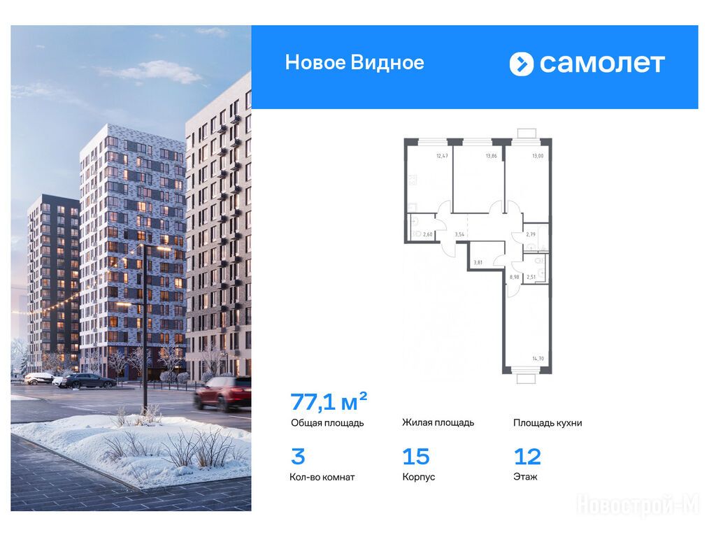 Продается трехкомнатная квартира в новостройке ЖК «Новое Видное» по адресу Московская область, Ленинский городской округ, Горки Ленинские Г/П, ЖК «Новое Видное»,корп.15. Общая площадь квартиры - 77.1 кв. м. Тип проекта, по которому построен дом — Монолитно-кирпичный, компания-застройщик — ООО СЗ «Самолет-Калиновка», Группа «Самолет». Стоимость квартиры — 17 748 416 руб. Способы оплаты можно уточнить у продавца. Более подробная информация по телефону.