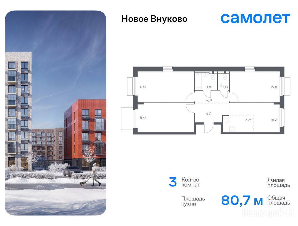 Продается трехкомнатная квартира в новостройке ЖК «Новое Внуково» по адресу Москва, ТиНАО, Новомосковский АО, Кокошкино С/П, Кокошкино пос., д. Санино, ул. Аэростатная, корп. 29. Общая площадь квартиры - 80.66 кв. м. Тип проекта, по которому построен дом — Монолитно-кирпичный, компания-застройщик — ООО СЗ «Санино 1», Группа «Самолет». Стоимость квартиры — 23 583 966 руб. Способы оплаты можно уточнить у продавца. Срок сдачи — 4 квартал 2025. Более подробная информация по телефону.
