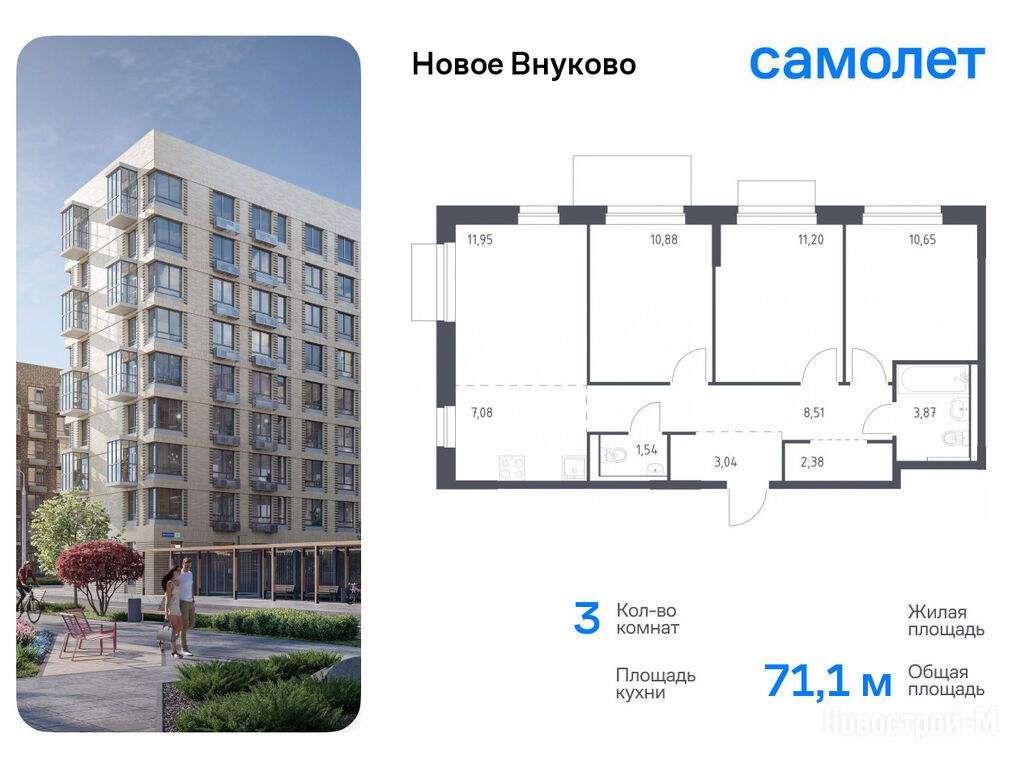 Продается трехкомнатная квартира в новостройке ЖК «Новое Внуково» по адресу Москва, ТиНАО, Новомосковский АО, Кокошкино С/П, Кокошкино пос., д. Санино, ул. Аэростатная, корп. 30. Общая площадь квартиры - 71.1 кв. м. Тип проекта, по которому построен дом — Монолитно-кирпичный, компания-застройщик — ООО СЗ «Санино 1», Группа «Самолет». Стоимость квартиры — 17 503 469 руб. Способы оплаты можно уточнить у продавца. Срок сдачи — 4 квартал 2025. Более подробная информация по телефону.