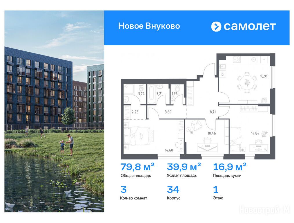 Продается трехкомнатная квартира в новостройке ЖК «Новое Внуково» по адресу Москва, ТиНАО, Новомосковский АО, Кокошкино С/П, Кокошкино пос., д. Санино, корп. 34. Общая площадь квартиры - 79.76 кв. м. Тип проекта, по которому построен дом — Монолитно-кирпичный, компания-застройщик — ООО СЗ «Санино 1», Группа «Самолет». Стоимость квартиры — 23 236 493 руб. Способы оплаты можно уточнить у продавца. Срок сдачи — 4 квартал 2027. Более подробная информация по телефону.