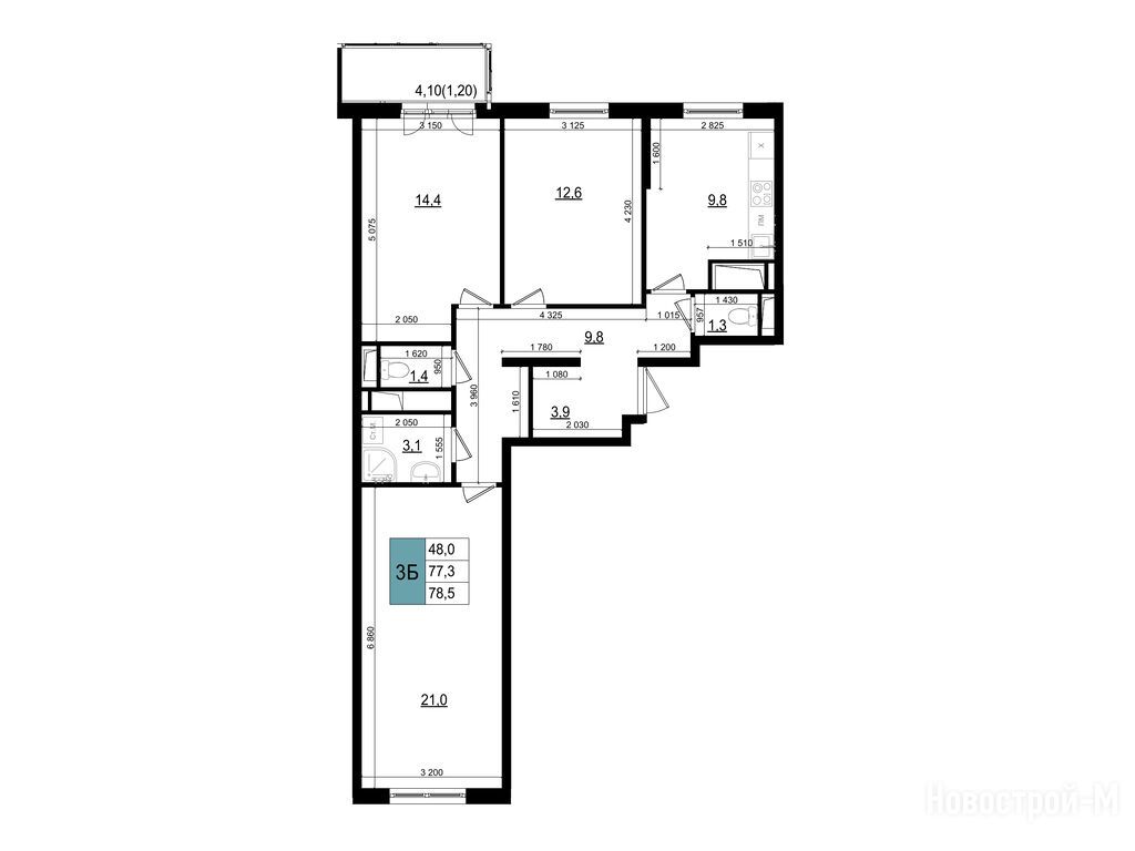 3-комн. квартира, 78.50 м2, 9 этаж