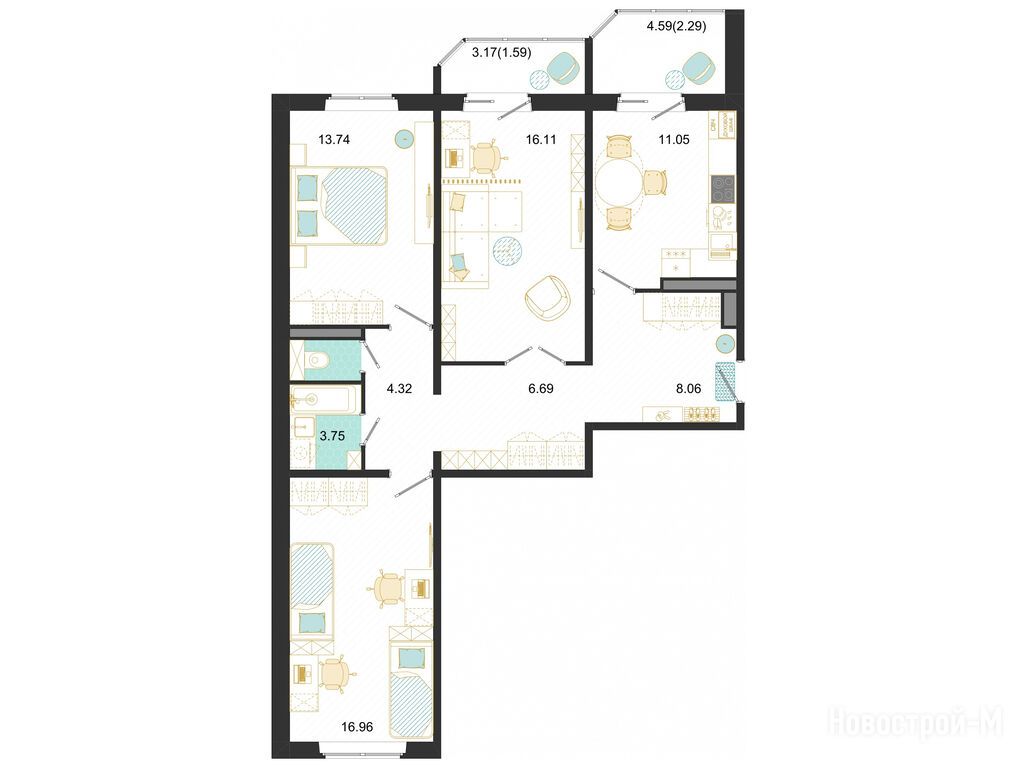 Расположение 3-комн. квартиры