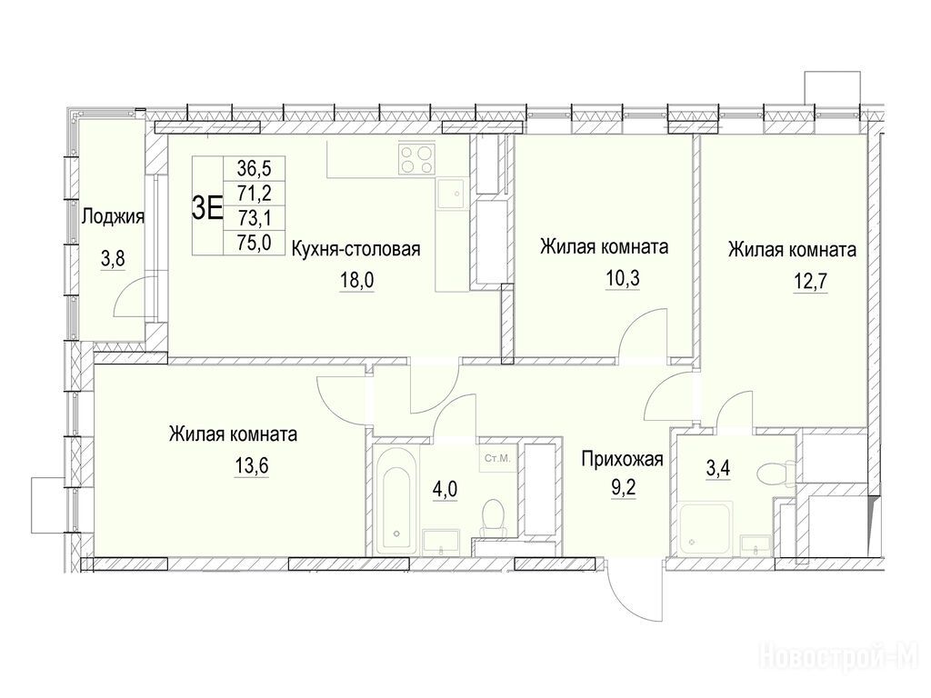 3-комн. квартира, 73.10 м2, 12 этаж