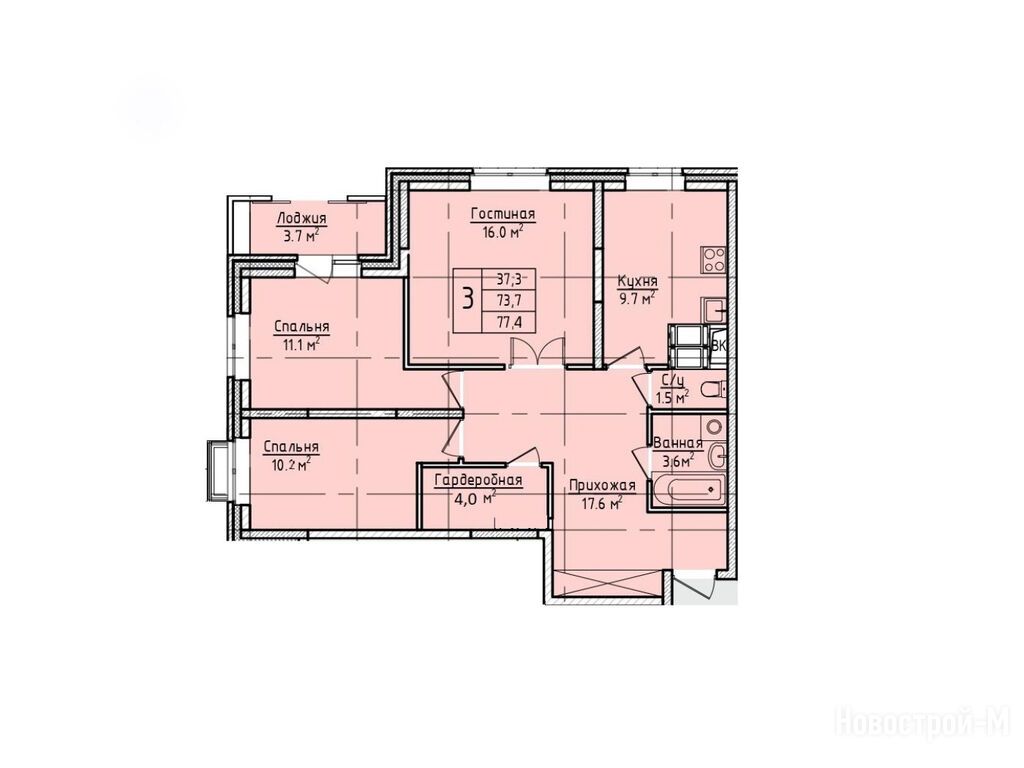 3-комн. квартира, 77.40 м2, 14 этаж