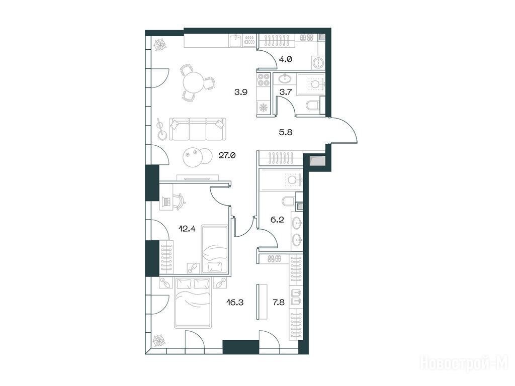 Достаточная территория для двора, немаленькая, подземный паркинг, стандартно - свой ритейл будет и клубная инфраструктура для жителей. Но почему мы решили тут купить квартиру: нашли планировку, которая полностью соответствовала нашим пожеланиям - большие комнаты, много пространства, две ванных и так далее.