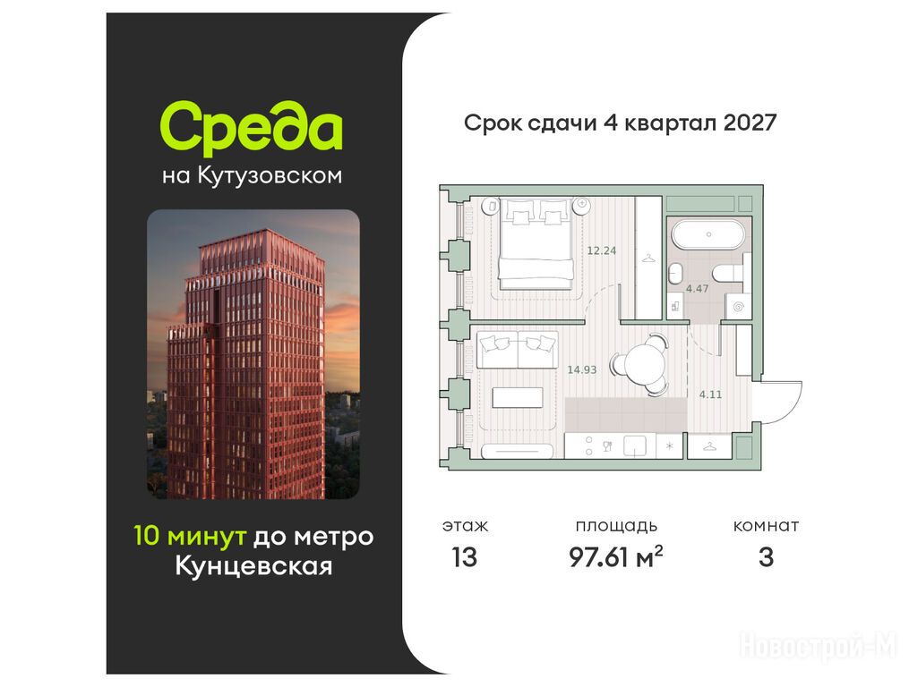 Продается трехкомнатная квартира в новостройке ЖК «Среда на Кутузовском» по адресу Москва, ЗАО, Кунцево, ул. Ивана Франко, корп. 4.1. Общая площадь квартиры - 97.61 кв. м. Тип проекта, по которому построен дом — Монолит,Железобетон, компания-застройщик — «Среда», АО СЗ Монетчик. Стоимость квартиры — 45 007 971 руб. Способы оплаты можно уточнить у продавца. Срок сдачи — 4 квартал 2027. Более подробная информация по телефону.