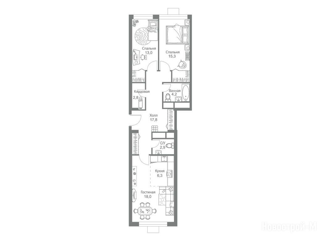 3-комн. квартира, 80.30 м2, 15 этаж