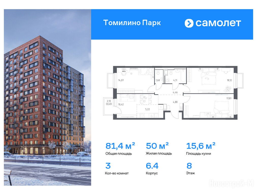 Продается трехкомнатная квартира в новостройке ЖК «Томилино Парк» по адресу Московская область, Люберцы городской округ, Томилино пос., ЖК «Томилино Парк», корп. 1-28. Общая площадь квартиры - 81.4 кв. м. Тип проекта, по которому построен дом — Монолитно-кирпичный, компания-застройщик — ООО СЗ «Самолет-Томилино», Группа «Самолет». Стоимость квартиры — 17 734 713 руб. Способы оплаты можно уточнить у продавца. Срок сдачи — 4 квартал 2027. Более подробная информация по телефону.
