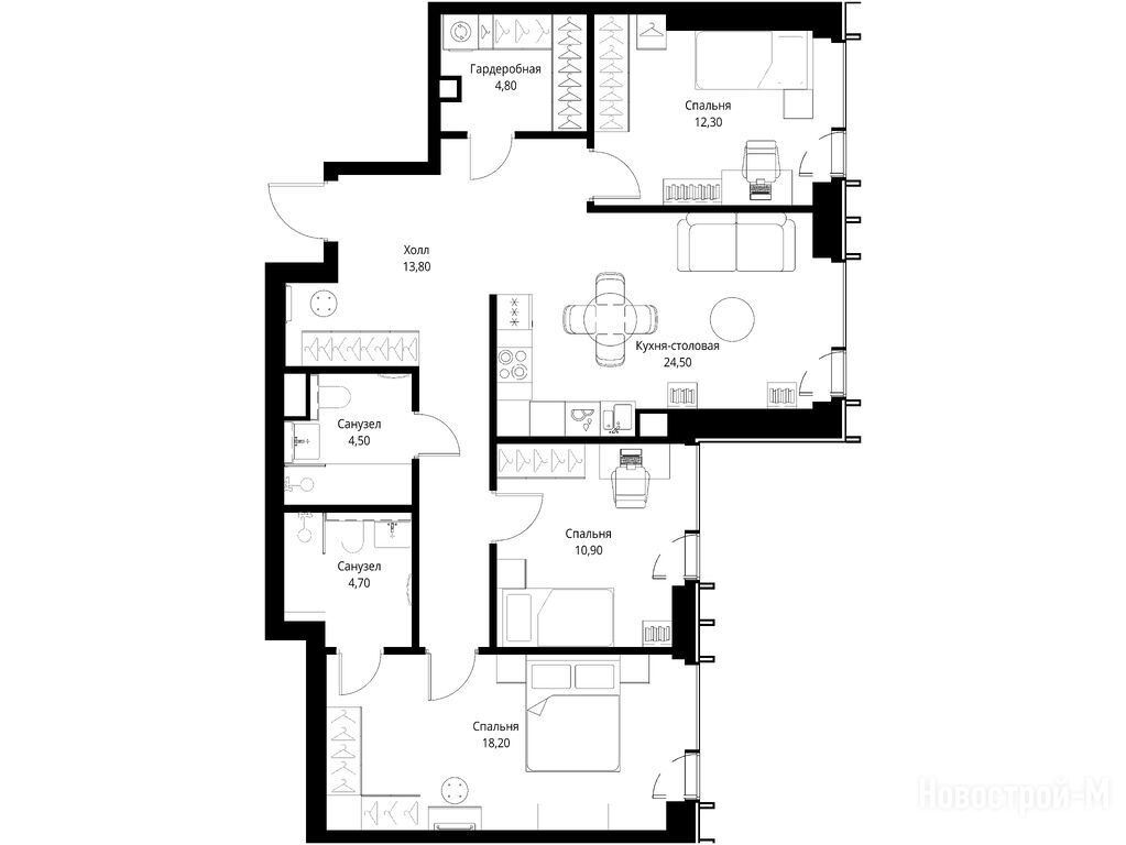 Пространство ощущается благодаря высоте потолков в 2,95 м. Отсутствие балконов, конечно, может расстроить, но панорамные окна во всю стену компенсируют этот недостаток, открывая прекрасный вид и наполняя квартиру светом.