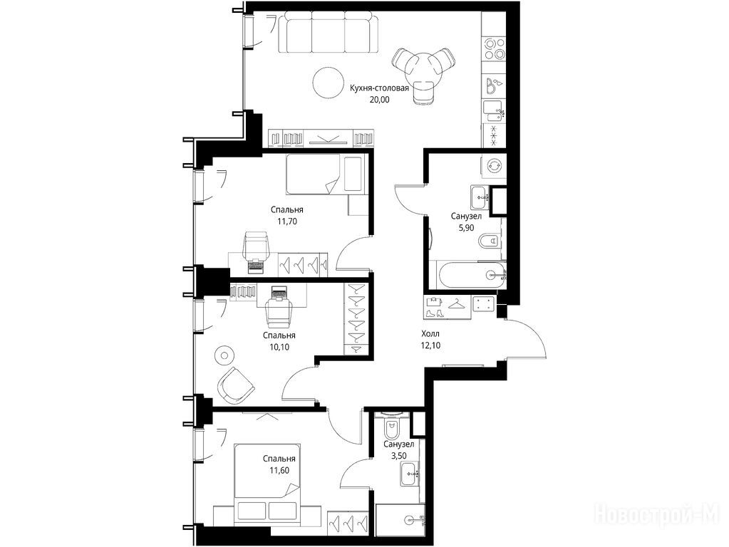 Пространство ощущается благодаря высоте потолков в 2,95 м. Отсутствие балконов, конечно, может расстроить, но панорамные окна во всю стену компенсируют этот недостаток, открывая прекрасный вид и наполняя квартиру светом.
