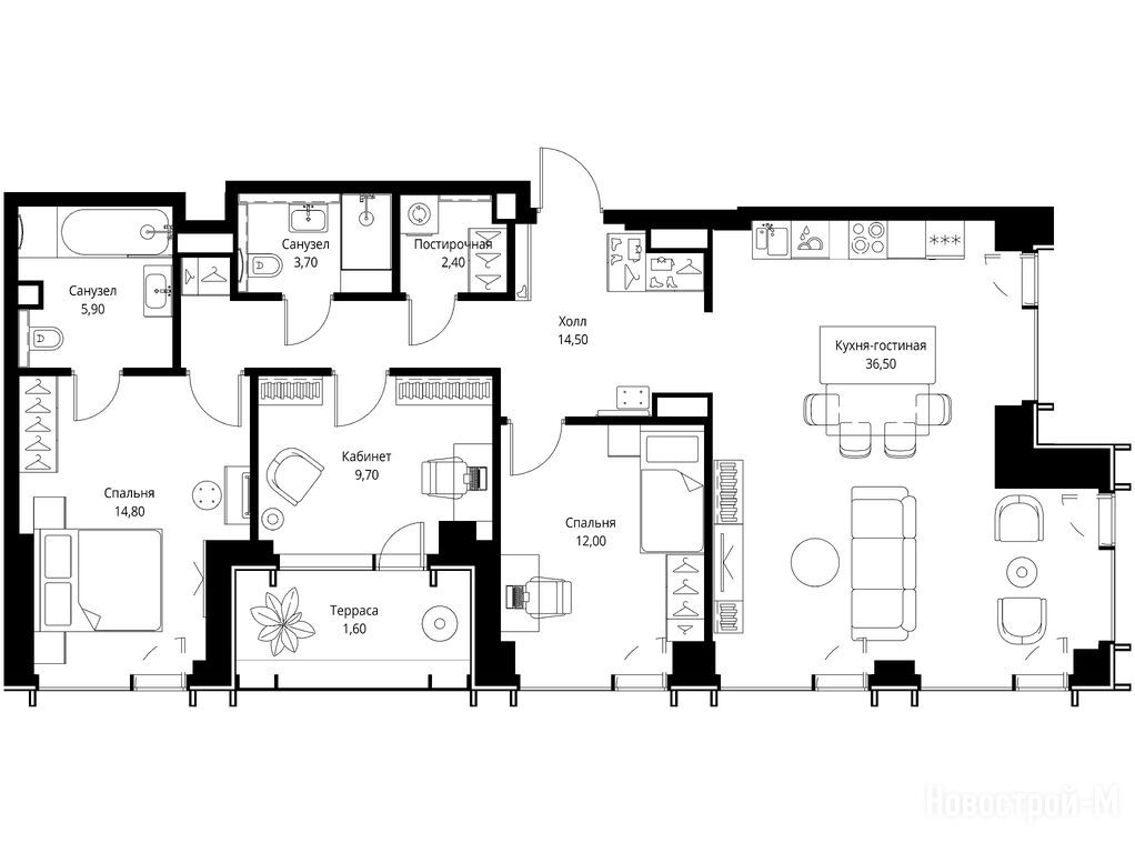 Пространство ощущается благодаря высоте потолков в 2,95 м. Отсутствие балконов, конечно, может расстроить, но панорамные окна во всю стену компенсируют этот недостаток, открывая прекрасный вид и наполняя квартиру светом.