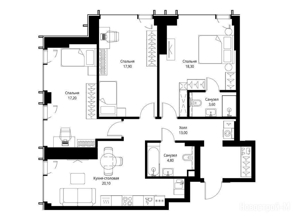 Пространство ощущается благодаря высоте потолков в 2,95 м. Отсутствие балконов, конечно, может расстроить, но панорамные окна во всю стену компенсируют этот недостаток, открывая прекрасный вид и наполняя квартиру светом.