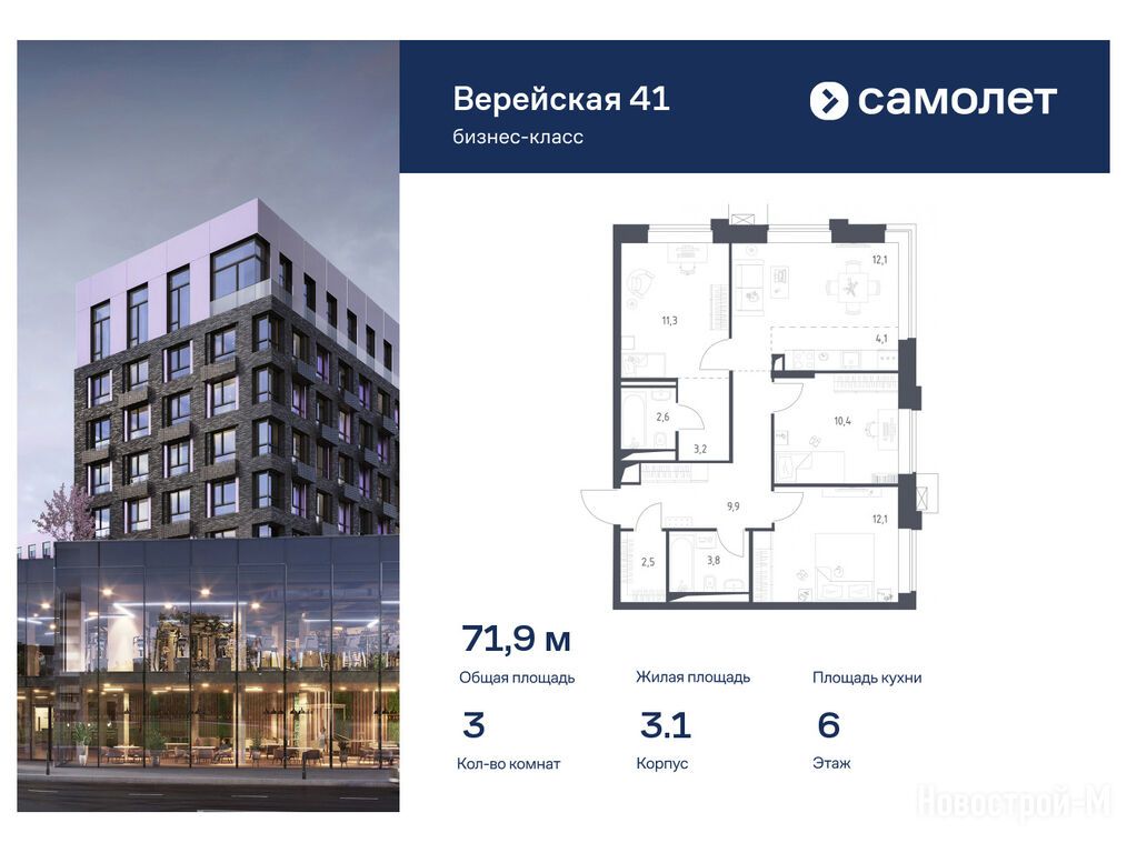 Продается трехкомнатная квартира в новостройке ЖК «Верейская 41» по адресу Москва, ЗАО, Можайский, Верейская 41, корп. 3.1. Общая площадь квартиры - 71.93 кв. м. Тип проекта, по которому построен дом — Монолитно-кирпичный, компания-застройщик — АО СЗ «Самолет-Верейская», Группа «Самолет». Стоимость квартиры — 39 498 894 руб. Способы оплаты можно уточнить у продавца. Срок сдачи — 1 квартал 2026. Более подробная информация по телефону.