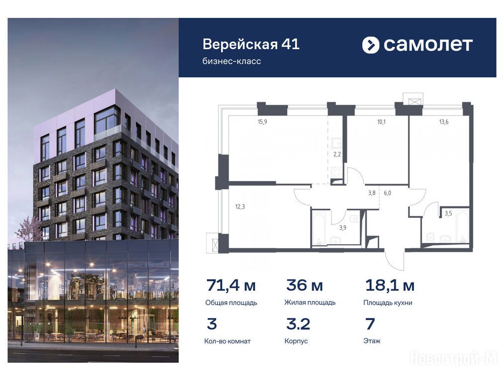 Продается трехкомнатная квартира в новостройке ЖК «Верейская 41» по адресу Москва, ЗАО, Можайский, МФК «Верейская 41», корп. 3.2. Общая площадь квартиры - 71.36 кв. м. Тип проекта, по которому построен дом — Монолитно-кирпичный, компания-застройщик — АО СЗ «Самолет-Верейская», Группа «Самолет». Стоимость квартиры — 43 339 467 руб. Способы оплаты можно уточнить у продавца. Срок сдачи — 1 квартал 2026. Более подробная информация по телефону.
