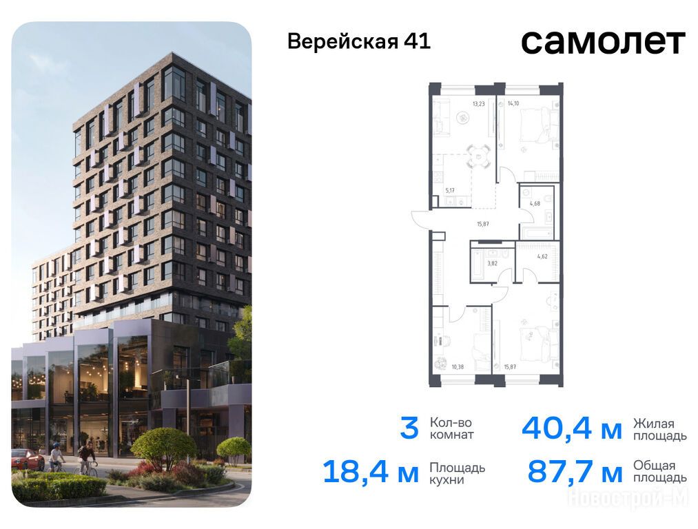 Продается трехкомнатная квартира в новостройке ЖК «Верейская 41» по адресу Москва, ЗАО, Можайский, МФК «Верейская 41», корп. 4.1. Общая площадь квартиры - 87.74 кв. м. Тип проекта, по которому построен дом — Монолитно-кирпичный, компания-застройщик — АО СЗ «Самолет-Верейская», Группа «Самолет». Стоимость квартиры — 50 203 336 руб. Способы оплаты можно уточнить у продавца. Срок сдачи — 1 квартал 2026. Более подробная информация по телефону.