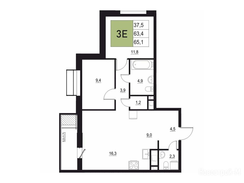 3-комн. квартира 63,40 м2 11 657 100