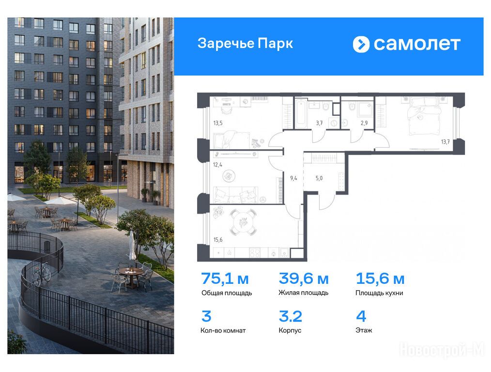 Продается трехкомнатная квартира в новостройке ЖК «Заречье Парк» по адресу Московская область, Одинцовский район, Успенское С/П, Заречье пос., ул. Заречная. Общая площадь квартиры - 75.1 кв. м. Тип проекта, по которому построен дом — Монолитно-кирпичный, компания-застройщик — Абсолют Недвижимость, Группа «Самолет», ООО СЗ «Самолет-Заречье». Стоимость квартиры — 26 587 728 руб. Способы оплаты можно уточнить у продавца. Более подробная информация по телефону.