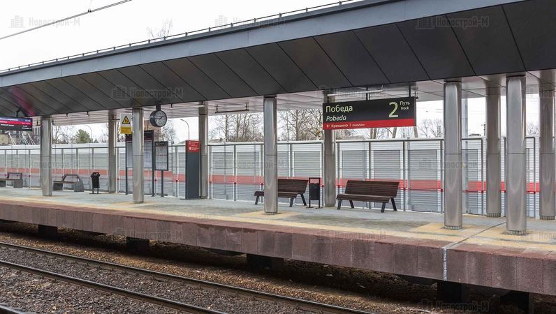 Станция Победа расположена между станциями Апрелевка и Крекшино. Неподалеку от нее находится ЖК «Времена года» (прежнее название — «Мелодия», застройщик — «Старт СК»). Это 12 монолитно-кирпичных домов высотой 9 этажей каждый. Цены на квартиры начинаются от 5,4 млн рублей.