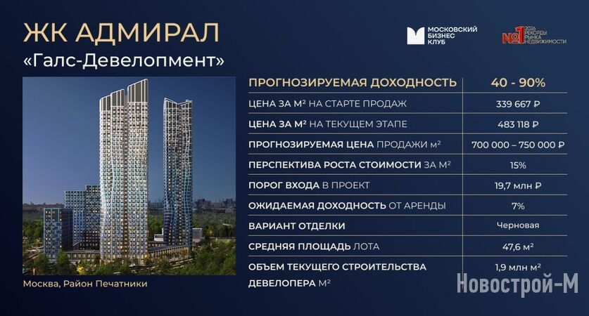 Неслучайно ЖК «Адмирал» вошел в топ-10 лучших инвестиционно-привлекательных проектов на рынке недвижимости 2026 года от Московского бизнес клуба и премии «Рекорды Рынка Недвижимости». Цифры по ЖК «Адмирал» подтверждают этот тезис наглядно: если на старте продаж в декабре 2024 года стоимость квадратного метра составляла 339,6 тыс. рублей, уже сегодня она выросла до 483,1 тыс. рублей. А к моменту готовности квартала купить квадратный метр «Адмирала» можно будет не меньше, чем за 660 тыс. рублей. Таким образом, только за 14 месяцев стоимость «квадрата» в проекте выросла на 42%. Интересно, что в самом «Галс-Девелопмент» отмечают, что средний рост стоимости лотов в жилых проектах компании составляет 25% в год – и это за первые три года строительства.