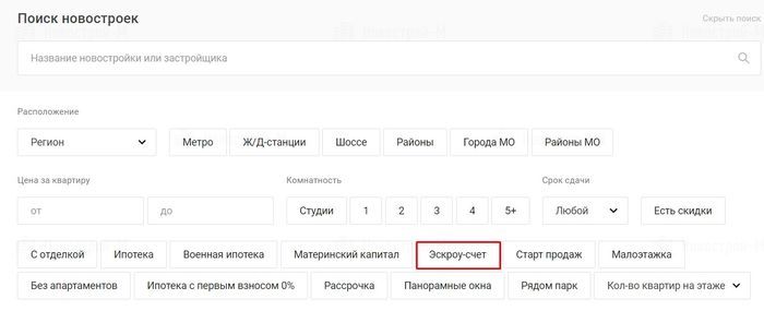 Теперь в форме поиска на Новострой-М можно отфильтровать все ЖК, в которых квартиры продаются по новым правилам, то есть через эскроу-счета.