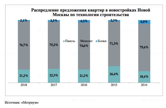 При этом в Новой Москве прослеживаются более четкие тренды — здесь доля предложения в монолитных домах планомерно растет на протяжении последних пяти лет. Это происходит за счет сокращения объемов панельного жилья и вытеснения с рынка блочного домостроения. Так, по итогам первых шести месяцев 2018 года доля квартир в монолитных домах составляла 76,7%, в панельных — 21,2%, в блочных — 2,1%. Годом ранее показатели были следующие: 75,2%, 22,3% и 2,5% соответственно.