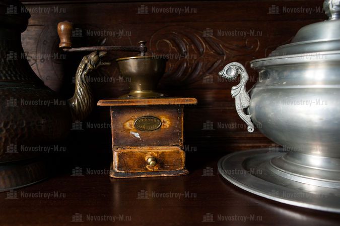 А вот наполнение кухни отдельными предметами создало впечатление достоверности. Вся мелкая утварь собрана по аукционам и антикварным лавкам, ей действительно пользовались реальные люди, она хранит аромат эпохи. Посуду в быту я предпочитаю современную из тех же технически-гигиенических соображений.