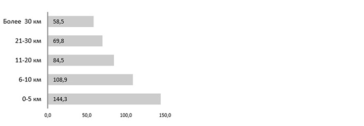 Средневзвешенная цена на первичном рынке Новой Москвы в зависимости от расстояния от МКАД тыс. руб/кв. метр