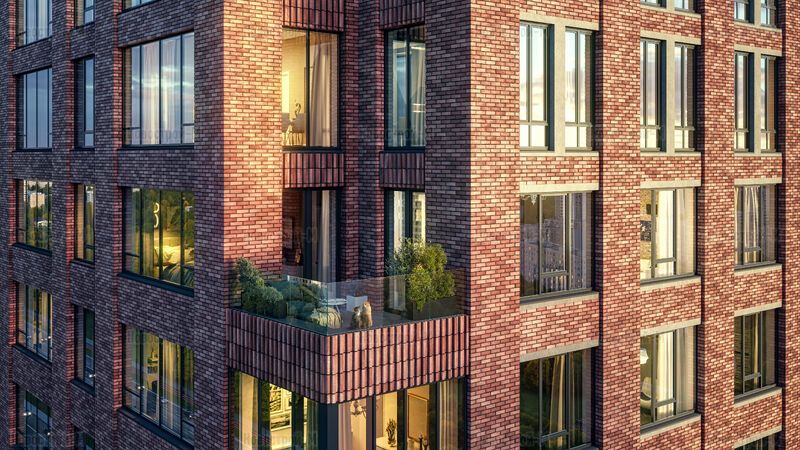 Активная пластика фасадов с балконами в нижней части зданий подчеркивают коммерческие помещения, а очертания верхних этажей — более спокойные и сдержанные.