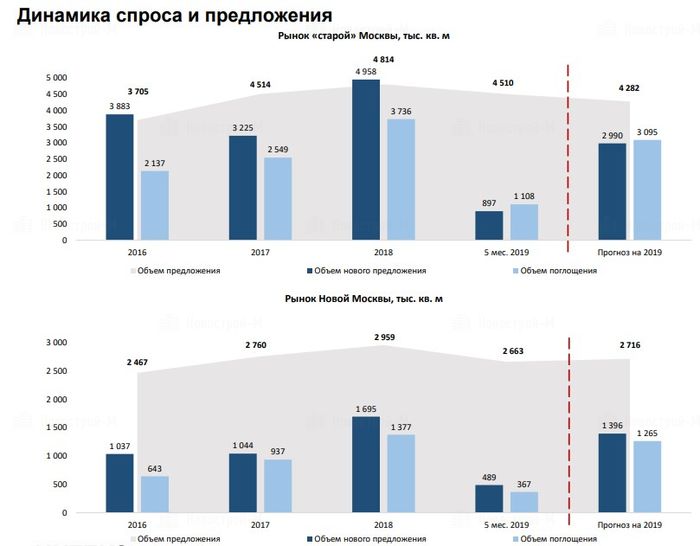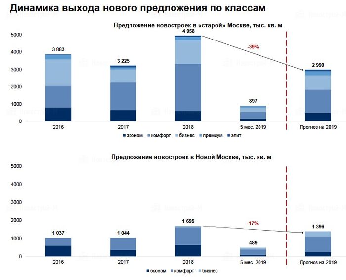 Как видно из графика, по сравнению с 2018 годом выход нового предложения в Москве сильно просел и в годовом выражении может упасть на 39%, даже не догнав показатели 2017 года. В Новой Москве также наблюдается спад, хотя и не такой сильный.