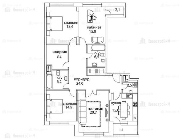 Как рассказал Василий Фетисов, в ЖК бизнес-класса «Серебряный фонтан» от Группы «Эталон» планировки многокомнатных квартир позволяют объединить в мастер-блок спальню хозяев, ванную комнату и дополнительную комнату с большим окном, где можно оборудовать кабинет.