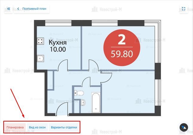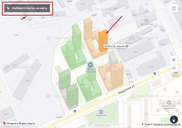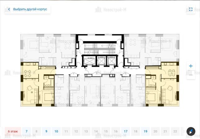Выбор корпуса, квартиры и планировки. Выбрать корпус ЖК вы можете в карточке проекта на сайте Новострой-М, наведя мышку на желаемый корпус. Кликнув на него, вы увидите поэтажный план ЖК с вариантами планировок квартир. Здесь же доступна информация о видах из окон квартиры, уровне ее инсоляции и отделке.