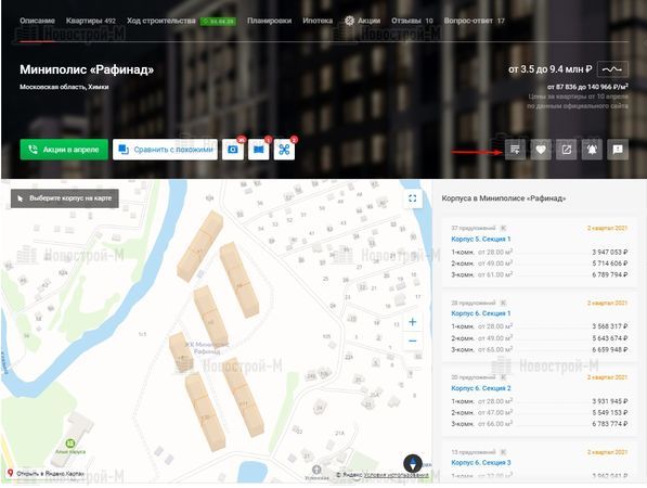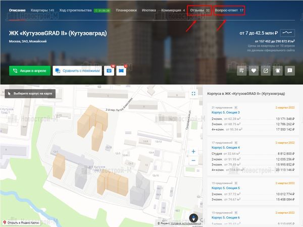 Сбор объективной информации о ЖК. Здесь помогут разделы «Отзывы» и «Вопрос-ответ» – они располагаются на верхней границе карточки выбранного вами комплекса. Там вы найдете объективные оценки пользователей сайта и покупателей, а также ответы на актуальные вопросы, касающиеся этапов строительства, локации, транспортной инфраструктуры и многого другого.