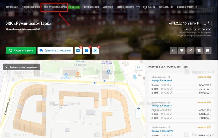 Посещение стройплощадки комплекса доступно в разделе «Ход строительства» – он находится на верхней границе карточки объекта. Там вы увидите актуальные фото стройки.
