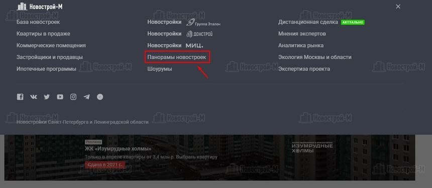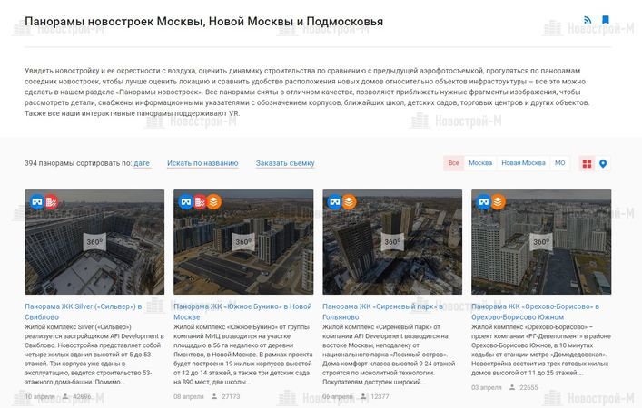 Посмотреть стройплощадку и окрестности с высоты птичьего полета помогут наши интерактивные панорамы с поддержкой VR – это раздел «Панорамы новостроек» в главном меню сайта Новострой-М или в карточке выбранного ЖК.
