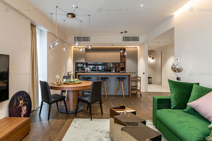 Гостиная с панорамным остеклением является продолжением кухни и вмещает в себя обеденную зону, а также зону отдыха с роскошным диваном и QLED телевизором. Общая площадь совмещенной кухни-гостиной равна 28 кв. м. Для оснащения, как этой зоны, так и других комнат, использована мебель премиальной марки BoConcept.