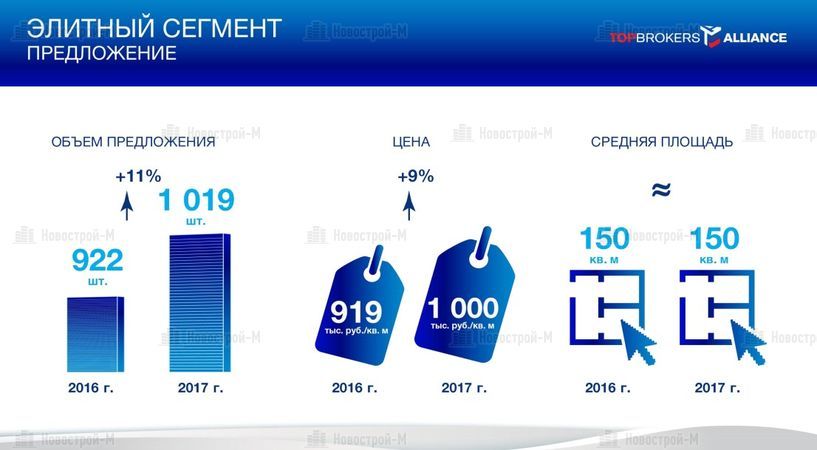За прошедший год объем предложения на первичном рынке элитной жилой недвижимости вырос на 11% и начало декабря 2017 года составил 1019 лотов. На рынок вышло шесть новых проектов: Barkli Gallery, MOSS Apartments, ORDYNKA, «Царев Сад», Roza Rossa Boutique Hotel & Apartments, «Малая Бронная, 15». За счет выхода на рынок объектов верхнего ценового сегмента, а также роста цен в отдельных комплексах с повышенной стадией строительной готовности, средняя стоимость 1 кв. м в элитных новостройках за год выросла на 9% и составила 1 млн руб. Лидером по объему предложения остаются Хамовники, где сконцентрирована треть всех лотов. Далее следуют Замоскворечье и Таганский район с долями соответственно в 16% и 12%. Средний бюджет сделок сократился на 26% и на начало декабря 2017 года составил 136 млн руб.