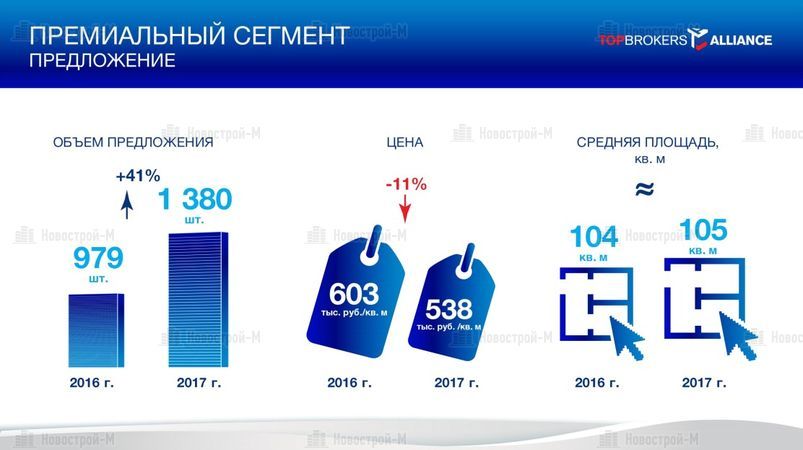 По сравнению с аналогичным периодом прошлого года, объем предложения на первичном рынке сегмента премиум вырос на 41% и на начало декабря 2017 года составил 1 380 квартир и апартаментов. В 2017 году предложение пополнилось 600 лотами в шести новых премиальных комплексах (A-Residence, NV/9 ARTKVARTAL, The Mostman, «Долгоруковская, 25», «Оливковый Дом», «Софийский»). За счет выхода на рынок новых крупных комплексов по стартовым привлекательным ценам, средняя стоимость предложения упала на 11%: с 603 тыс. руб. за кв. м в начале декабря 2016 года до 538 тыс. руб. за кв. м в 2017 году. Самым популярным районом у покупателей остаются Хамовники, в 2017 году практически каждая третья сделка была заключена здесь. на второй строчке по количеству сделок располагается район Замоскворечье (15%), далее следует Пресня с долей в 14%.