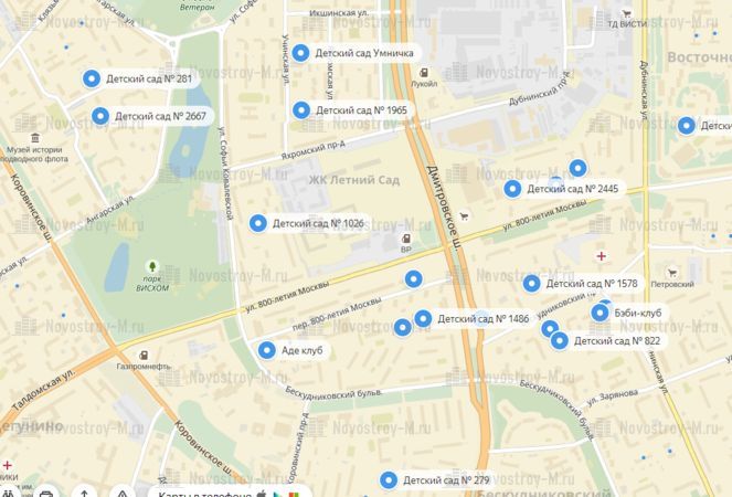 Аналогичная картина и с детскими садами. Ближайший (№1026) отделен от ЖК «Город» одним из домов (в сторону улицы Софьи Ковалевской). Через дорогу есть детский сад №1486 и школа-сад №849, а также детский клуб «Панда». Сложно сказать, насколько заполнены все эти учреждения, но детская инфраструктура в локации действительно представлена в изобилии. Забегая немного вперед, также скажу, что в соседнем ЖК «Летний сад» появится школа на 800 учеников и 2 детских садика.