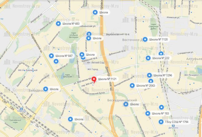 Буклет сообщает, что вблизи ЖК «Город» есть более десятка школ, 20 детских садов, центры образования и гимназии. Что ж, карта действительно показала мне много школ, например, школа №1121 прямо напротив ЖК «Город» - нужно просто перейти улицу 800-летия Москвы. Вблизи парка Ангарские пруды есть школа №771, а в сторону центра есть музыкальная школа.