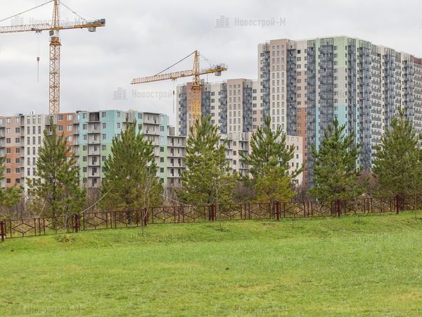 Справа от вас будет лесопарк, через который в будущем застройщик обещает сделать дорожку, благодаря чему путь от новостройки к метро будет не 15 минут, а немного меньше (сейчас нужно идти под прямым углом от метро к комплексу, а через лесопарк путь будет как бы по гипотенузе).