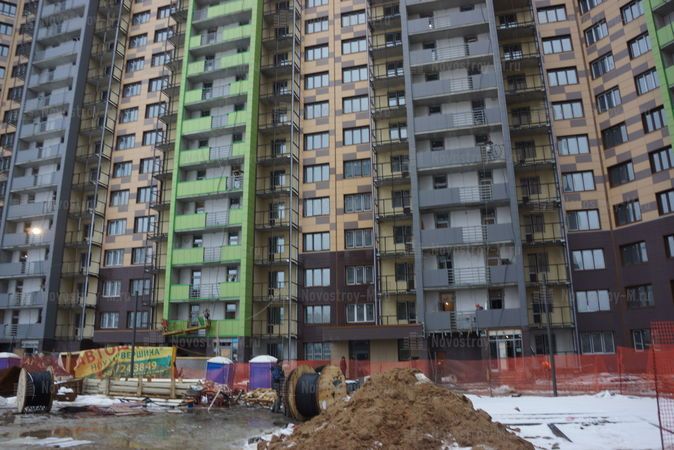 Первая очередь строительства – это 17-этажные дома №3 и №4 (3 и 6 секций соответственно). Их строительство в данный момент подходит к концу, ведутся работы по отделке фасадов. Окончание должно произойти в I квартале 2016 года, а ключи дольщики получат в июне текущего года. На сайте ФСК «Лидер», правда, был указан срок сдачи первой очереди – IV квартал 2015 г., видимо, планировалось сдать ее немного раньше, но не получилось.