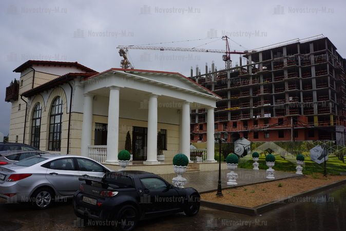 В офис продаж на объекте я отправилась утром в выходной. Маршрутка от железнодорожной станции была на месте задолго до времени отправления (её было нетрудно найти, благодаря фирменному оформлению). Здание офиса продаж выглядит капитальным, выдержано в классическом стиле, площадь вокруг него – чистая и красивая.