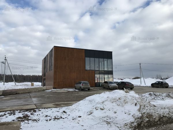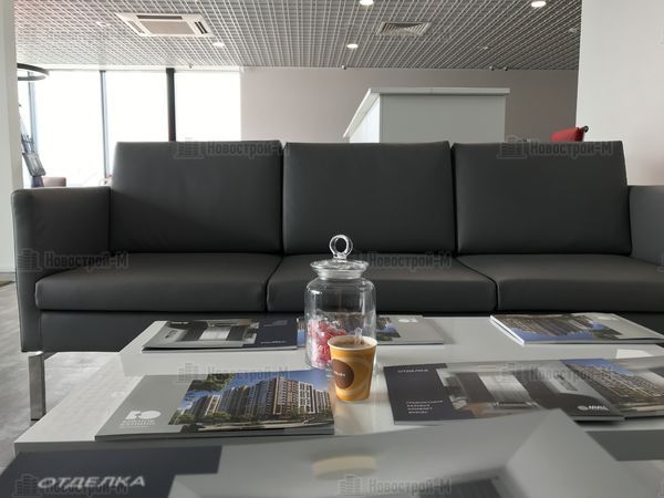 Офис продаж комплекса - это небольшое двухэтажное здание коричневого цвета с панорамными окнами. В нем все сделано для удобства посетителей – есть диваны со столиками, предлагаются бесплатные напитки (мне понравился горячий шоколад). Прямо перед офисом есть парковка, где можно оставить свой автомобиль на время визита. Детского уголка я не заметил.
