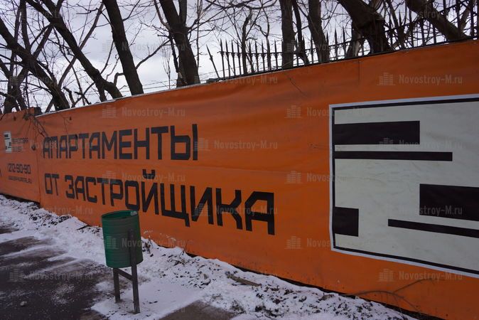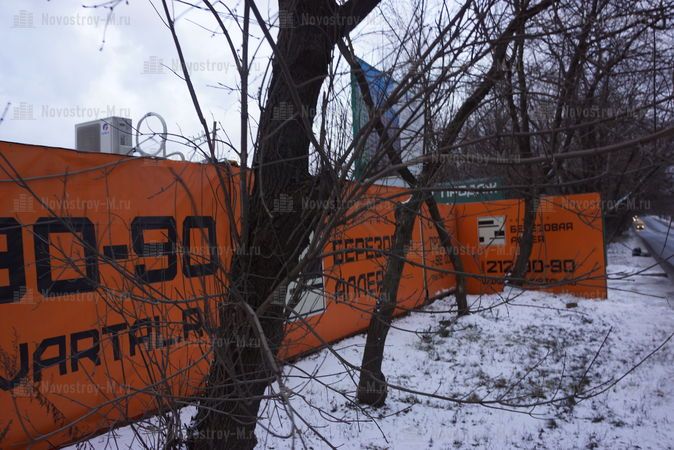 Никаких звуков со стройки не доносится, не видно ни рабочих, ни работающей техники. Стройплощадка от улицы огорожена глухим бетонным забором, так что попытки «зайти с тыла» и подсмотреть хоть что-то не увенчались успехом. Дверь от офиса продаж находится под охраной, незаметно в неё тоже не пройти.