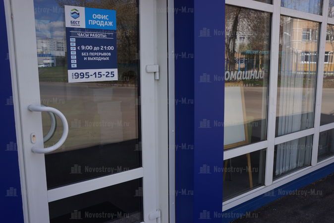 На стройку я традиционно поехала в выходной, но офис «Бест-Новострой» работает каждый день с 9:00 до 21:00 (то есть можно съездить и пораньше, и успеть после работы). Менеджер по имени Вадим предлагал встретить меня на остановке общественного транспорта, но в этом не было необходимости – все офисы продаж ярко оформлены и видны с остановки.