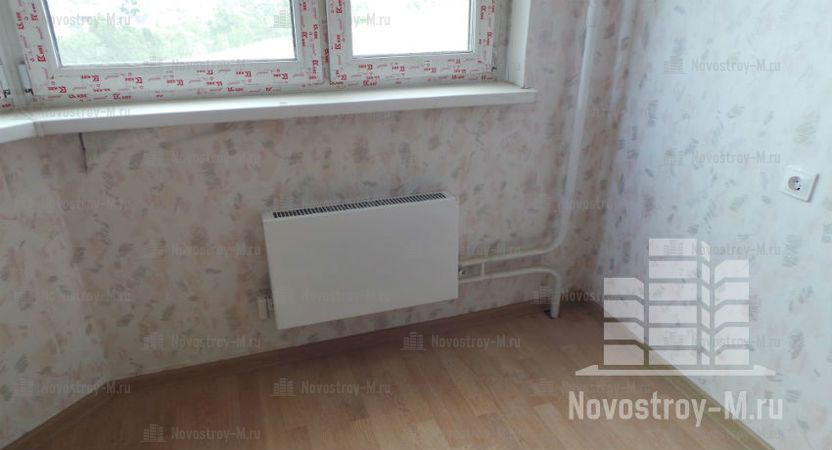 Однокомнатная квартира, которую я смотрела в уже построенном доме, продавалась по переуступке. Внешне — это копия той, что я планировала «купить». При входе установлена самая простая дверь, в комнате обоями оклеены не только стены, но и зачем-то потолок. При этом верхний их край отрезан неровно. Обои бумажные, на стене местами отошли и вздулись. На фото отчетливо видно, что кусок обоев рядом с батареей отопления надорван. Стеклопакеты установлены качественные, уличного шума не слышно совсем, но откосы при этом внешне не выровненные, штукатурка легла криво.